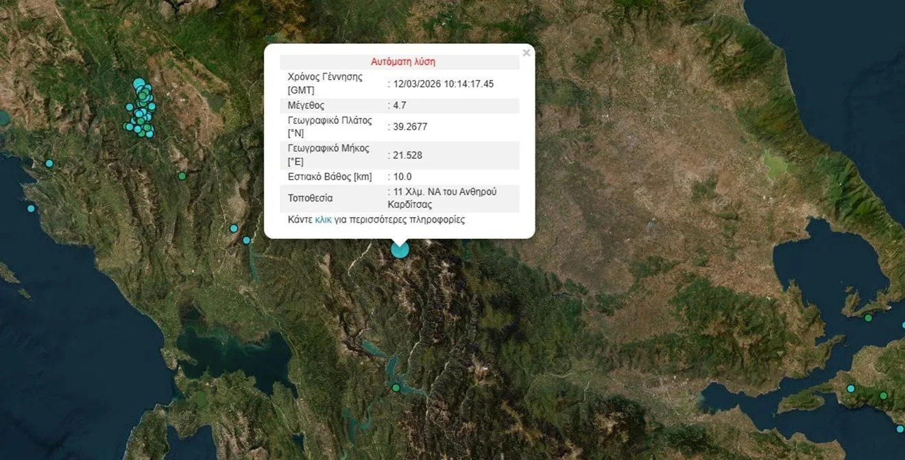 Αναστάτωση προκάλεσε σεισμική δόνηση μεγέθους 4,7 βαθμών της κλίμακας Ρίχτερ που σημειώθηκε λίγο μετά τις 12 το μεσημέρι στην περιοχή της Καρδίτσας, χωρίς μέχρι στιγμής να έχουν αναφερθεί σοβαρές ζημιές ή τραυματισμοί.